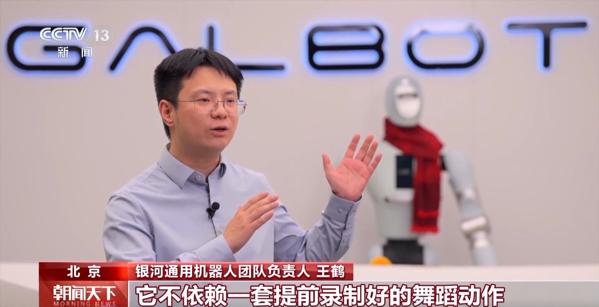 银河通用机器人团队负责人 王鹤:和传统的舞蹈机器人不同,它不依赖一套提前录制好的舞蹈动作,也不需要遥控器。银河通用机器人搭载了我们自研的具身大模型银河星脑,它能够让我们机器人看得懂环境,听得懂人类的指令,自主干好活。